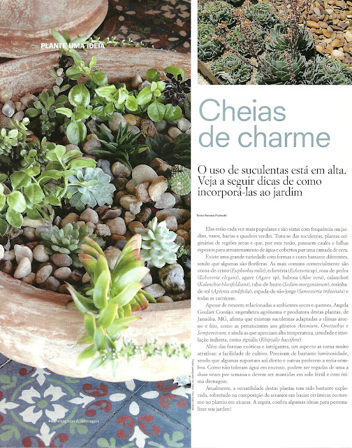 Algumas semanas atrás, saiu uma matéria sobre o uso de suculentas na Revista Paisagismo & Jardinagem da editora Casa Dois, edição 114. respondi algumas perguntas e quem tiver o interesse, abaixo está na íntegra a matéria de Renata Putinatti sobre como incorporar as suculentas ao seu jardim. Se quiser adquirir um exemplar clique aqui.